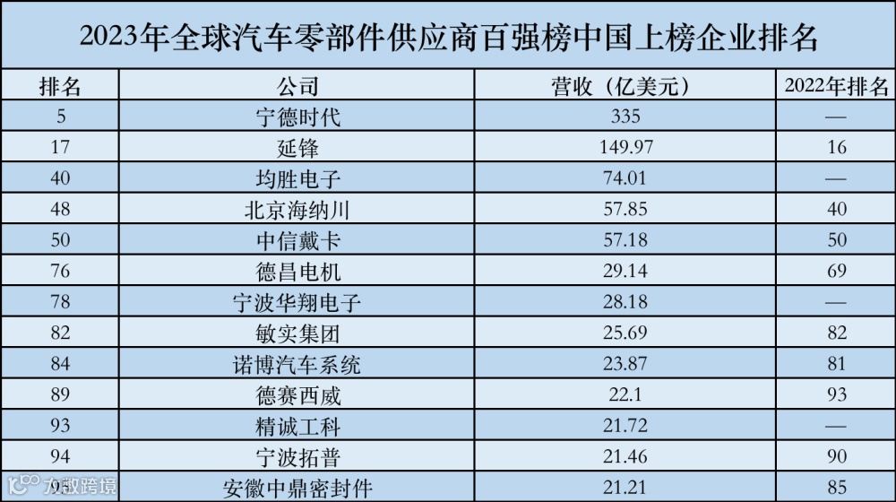 《美国汽车新闻》近日发布2023年全球汽车零部件供应商百强榜,榜单依据各企业上一年度在汽车配套市场的销售额进行排名。中国动力电池龙头企业宁德时代首次进入前五,位列第五,预计2022年全球汽车业务收入达335亿美元,成为前十中唯一主营电动汽车零部件的供应商。