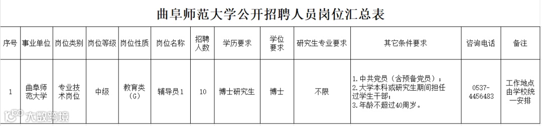 根据事业单位公开招聘有关规定,结合工作需要,我校拟面向社会公开招聘博士辅导员10人,具体岗位及条件详见《曲阜师范大学2026年度公开招聘人员岗位汇总表》(附件1)。