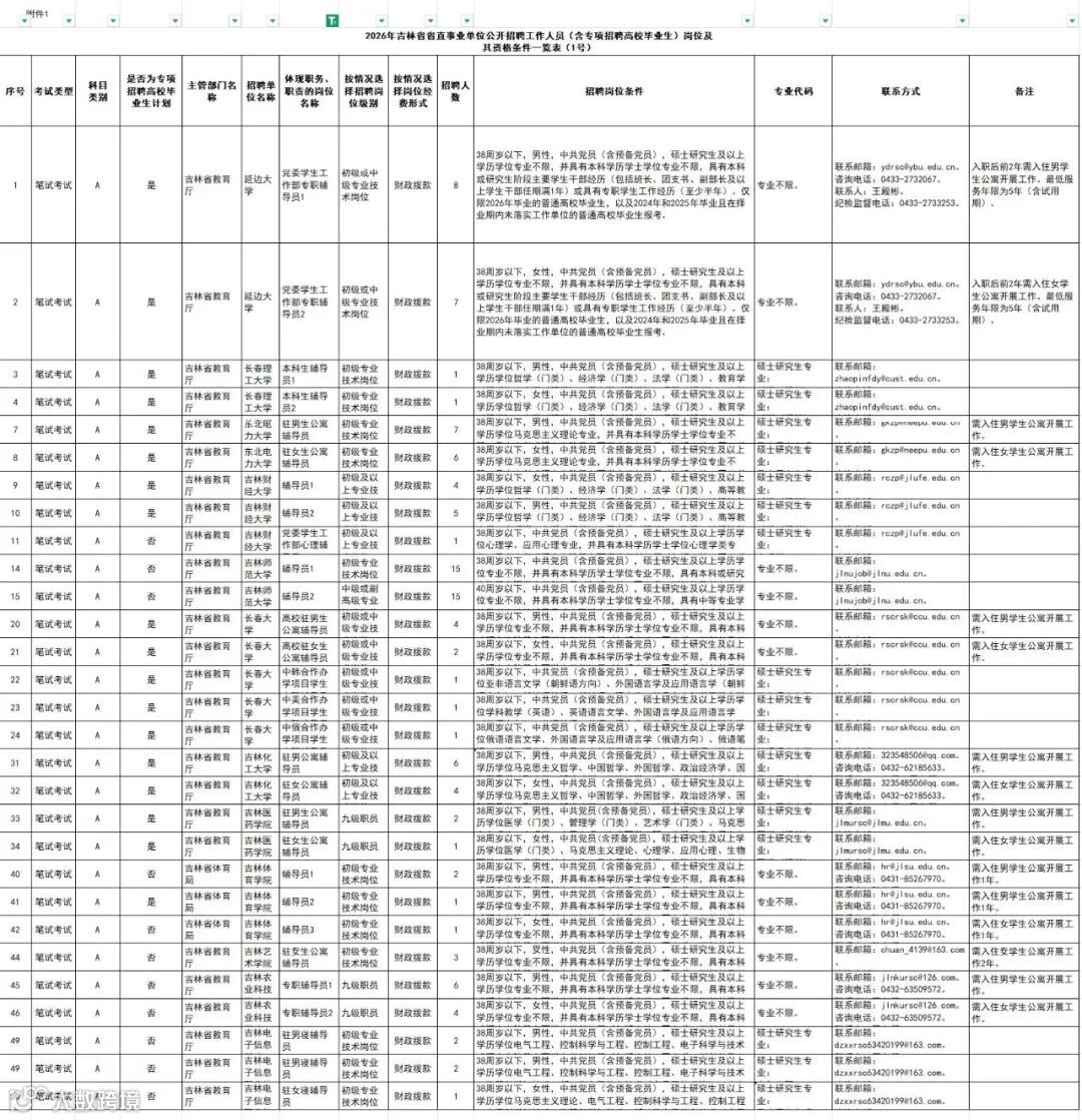 附件1:2026年吉林省省直事业单位公开招聘工作人员(含专项招聘高校毕业生)岗位及其资格条件一览表(1号).xls