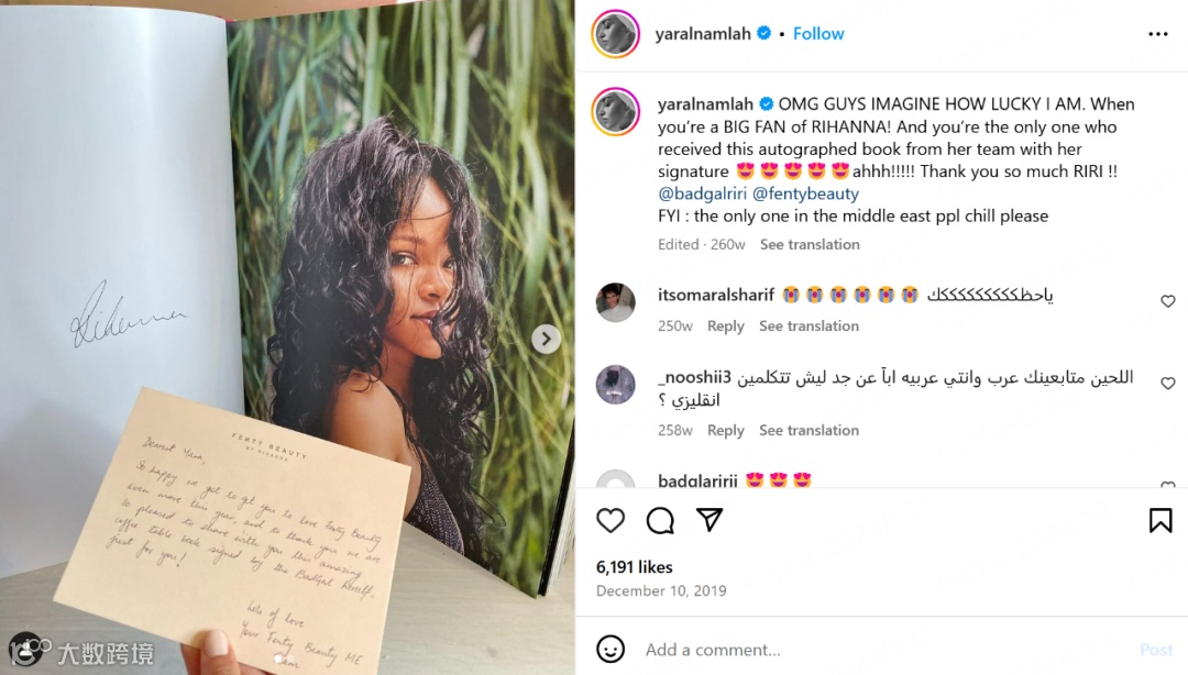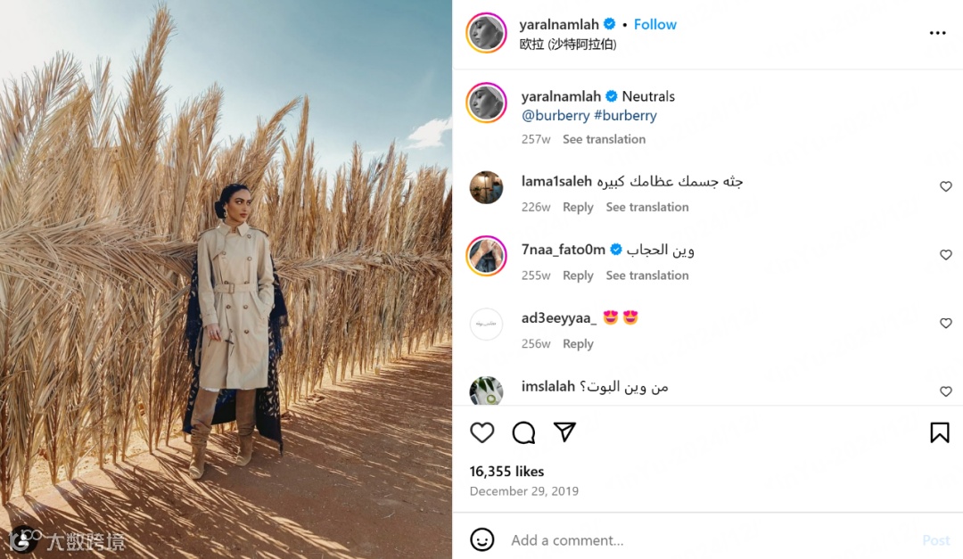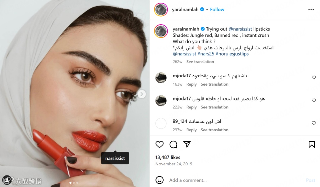 随着沙特2030愿景的深入推进,越来越多的外国品牌想要通过KOL推广进入沙特市场,既有个人风格又有沙特印记的Yara自然成为了炙手可热的合作对象。仅在2019年,她就和CHAUMET、Fendi、Fenty Beauty、Dior、Gucci、Nars、兰蔻、祖马龙、mac等品牌进行了推广合作。