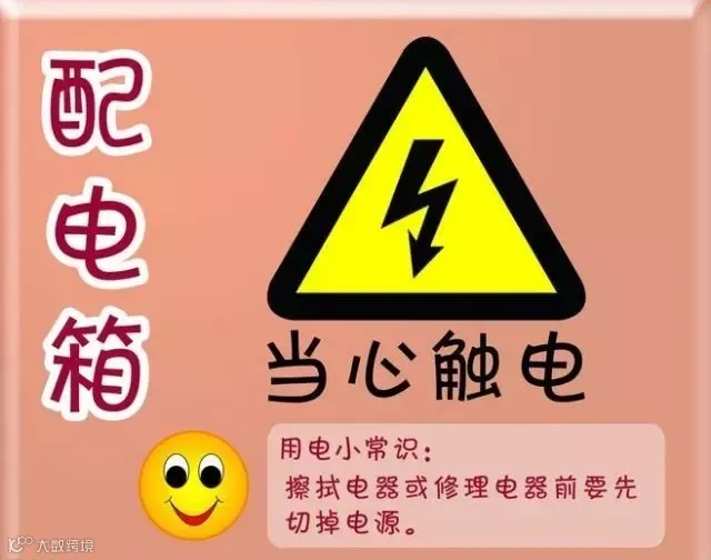 当心触电警示标识张贴在有可能发生触电危险的电器设备和线路如:配电室、开关等