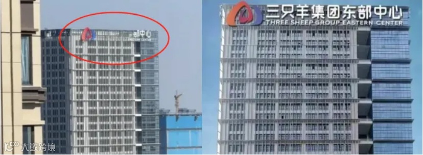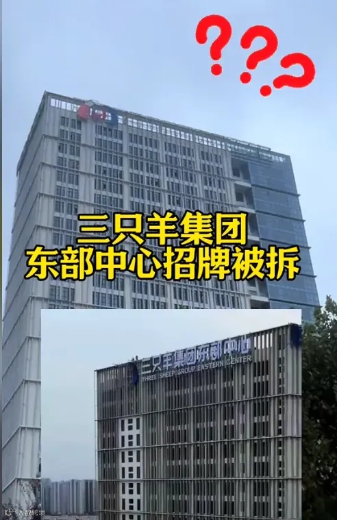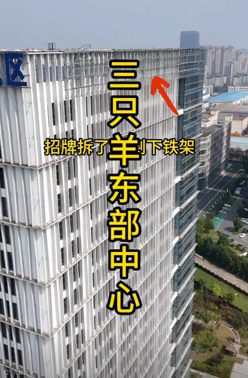 视频显示,三只羊集团东部中心的明显标志已被默默拆除,原来的“三只羊集团东部中心”现如今只剩下了三只羊集团的logo还在楼顶挂着。