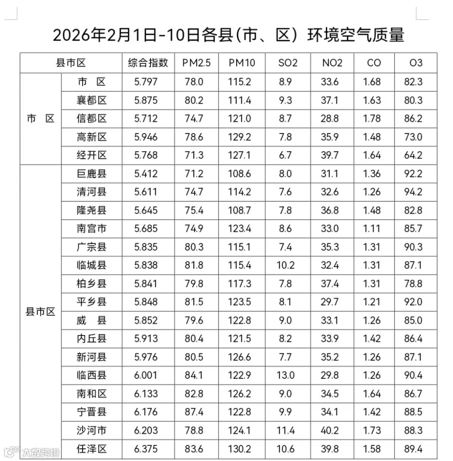 市生态环境局公布了2026年2月1日-2月10日各县(市、区)环境空气