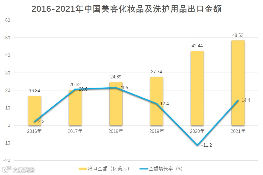 而近期中国海关总署发布了 2021 年中国美容化妆品及洗护用品的出口金额。数据显示,2021 年出口金额达 48.52 亿美元,金额增长率为 14.4%,结合历年的出口金额来看,我国美容化妆品及护肤品进出口总额呈现逐年增长态势。