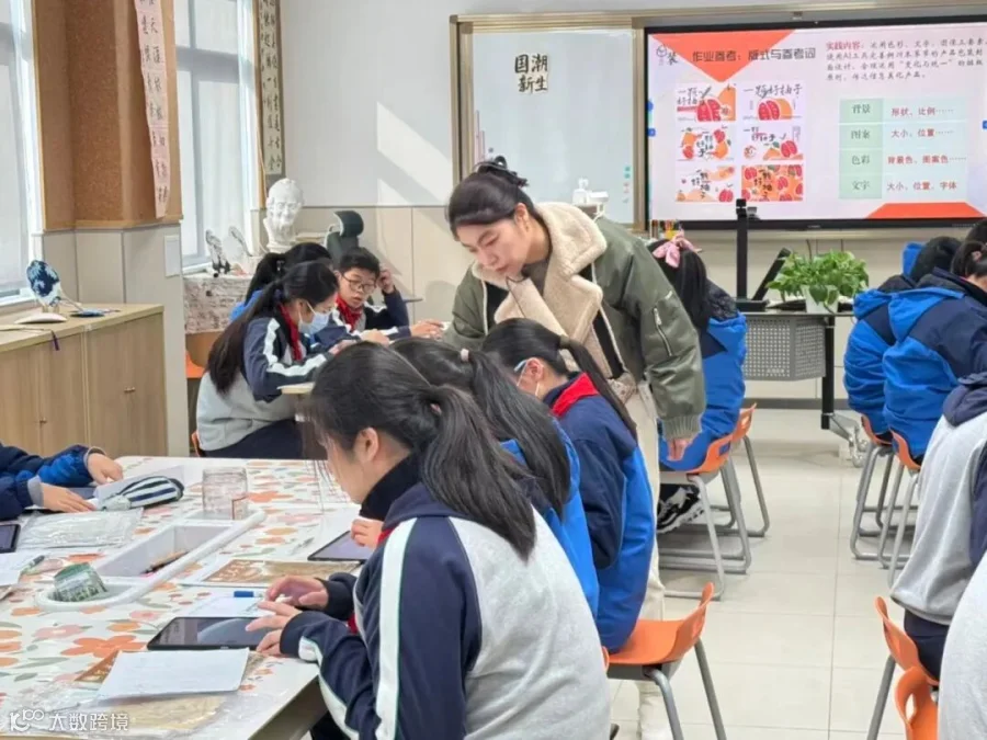 王曼恬老师的美术课以“国潮国风”为主题,基于校园传统文化活动“本草节”真实需求,打造“守正创新”的设计课堂。课堂聚焦包装封面排版优化,借助豆包AI、“三个助手”等数智工具,破解学生“创意难落地”的痛点。通过提炼视觉三要素、解析版式设计原则,引导学生将传统文化元素转化为精准提示词,生成兼具传统韵味与现代美感的包装设计。在自评互评中深化审美认知,实现数字技术与传统美育的深度融合。