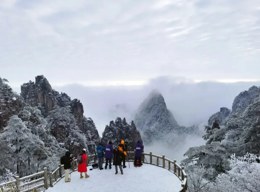 带着惊喜登上白鹅岭观景台,只见左侧的白鹅峰顶白雪皑皑,像一只展翅欲飞又陶醉着不忍离去的天鹅;右侧的石鼓被雪包裹,朦胧又刚柔,仿佛有一段音乐就会舞动起来。在雪的世界里,黄山诸峰构成一幅洁净的画卷,峡谷幽深静谧,谷底云雾升腾,云海若隐若无……