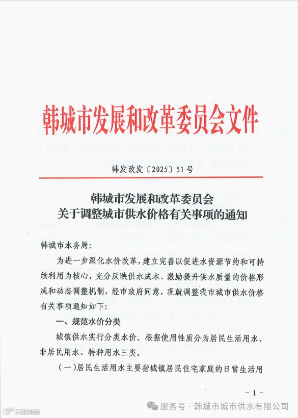 根据《韩城市发展和改革委员会关于调整城市供水价格有关事项的通知》(韩发改【2025】51号)文件要求,经成本监审、听证会征求意见、集体审议等程序,我市自来水价格将于2025年11月1日起调整。现将文件内容公告如下: