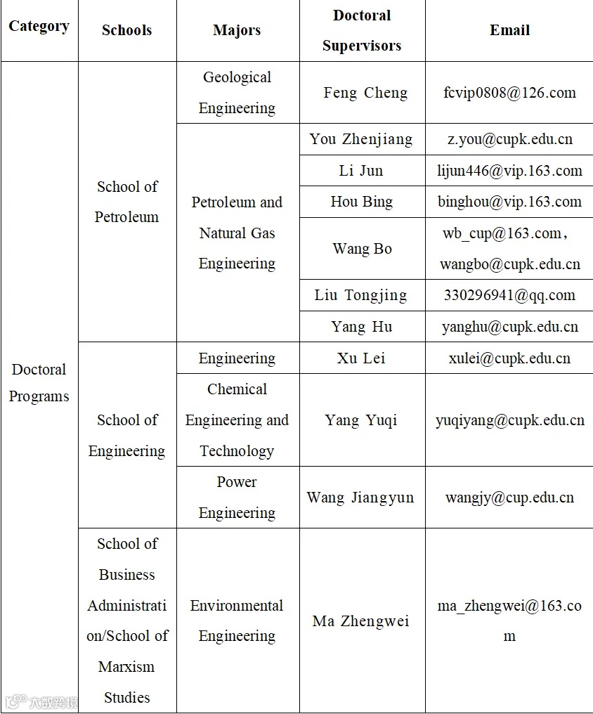 CUPK recruits international graduate students for Doctoral programs from countries around the world, whose enrollment majors, language of instruction, and normative study period are listed in the table below: