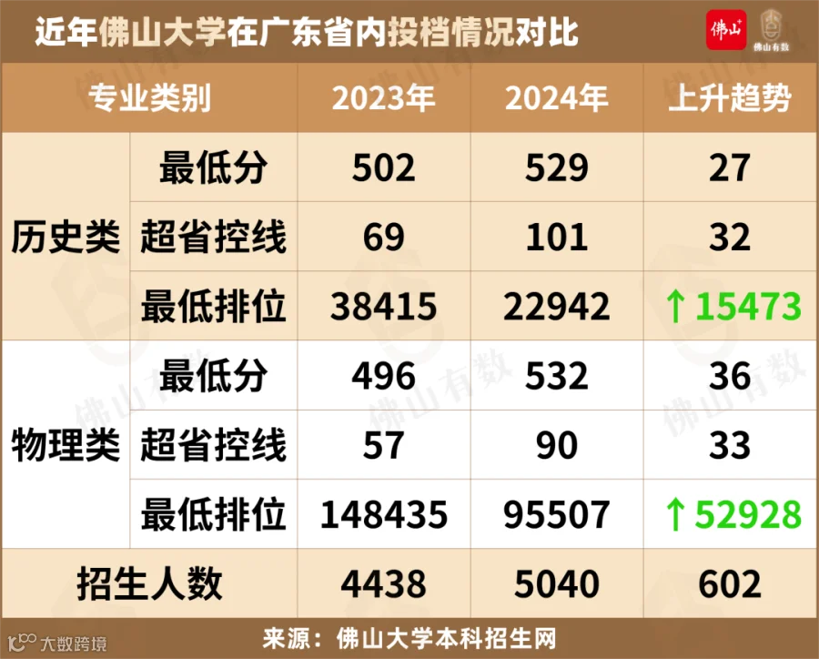 更名后,佛山大学的录取门槛显著提高,2024年,除去中外合作办学、地方专项等特殊专业组情况,历史类和物理类的录取最低排位均实现“暴涨”:历史类最低排位上升15473名,物理类最低排位上升52928名!