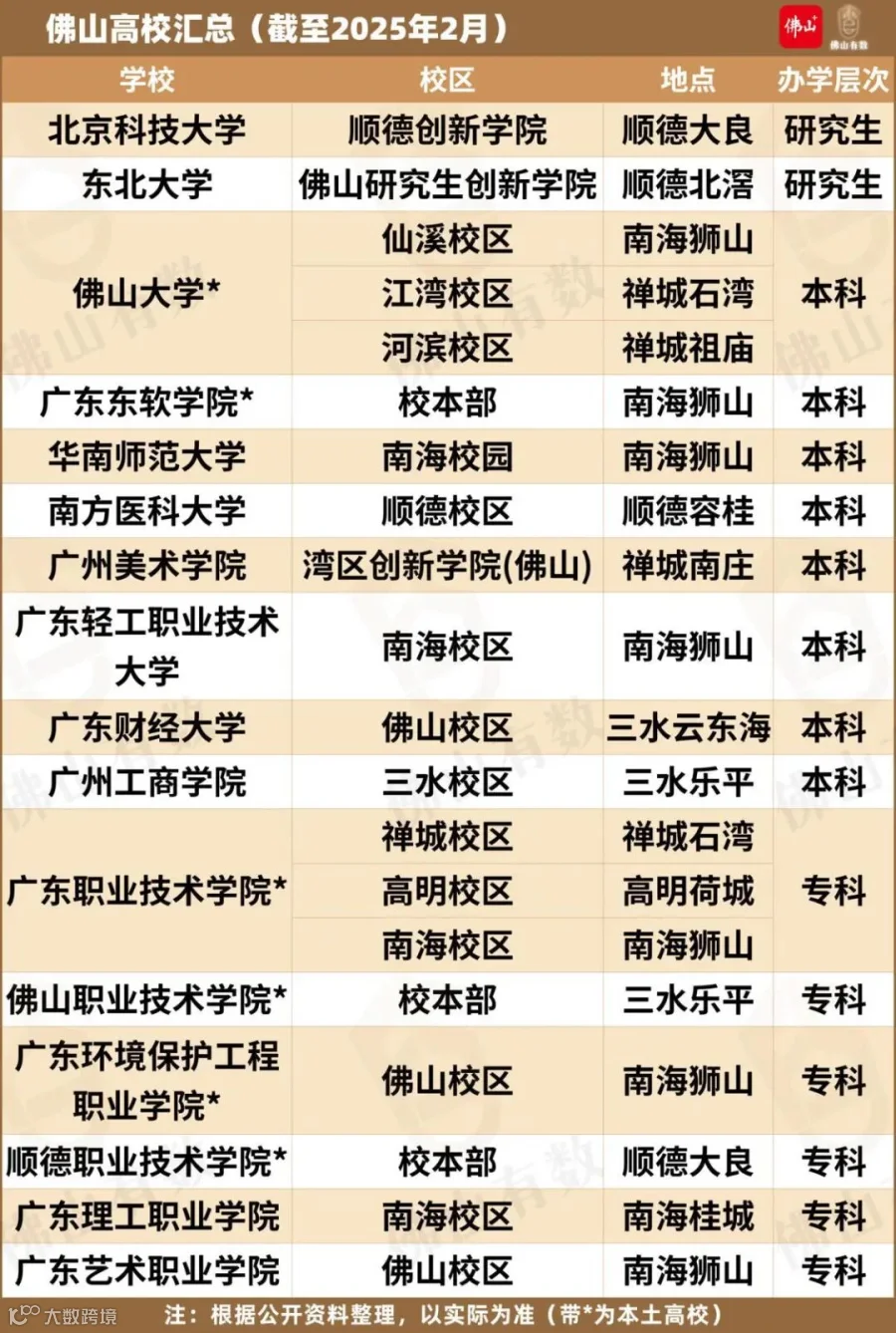 值得一提的是,佛山16所高校中,有6所为本土高校,包括2所本科院校(佛山大学、广东东软学院)和4所专科院校。