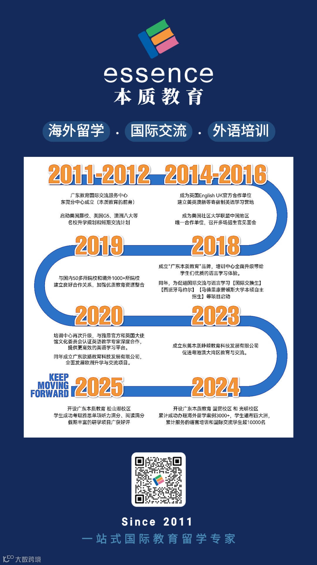 广东本质教育Essence成立于2011年,前身是「广东教育国际交流服务中心东莞分中心」,提供一站式国际教育服务,打通“选校定位+申请冲刺+备考提分”全链路!用专业态度和贴心服务,助力学员取得满意的升学成果!
