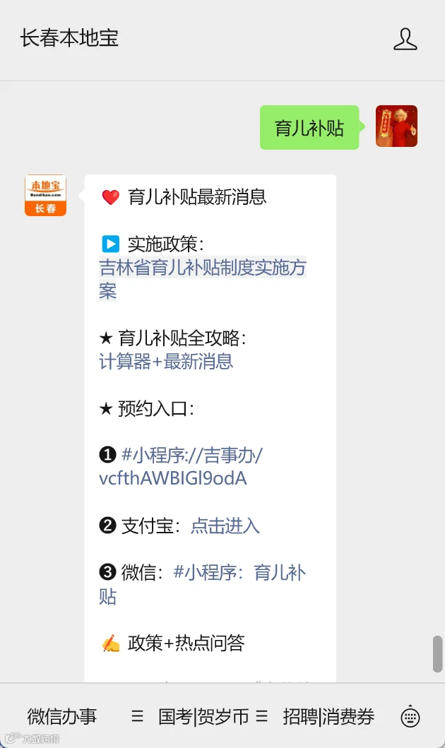 识别下方二维码,关注【长春本地宝】公众号,回复【育儿补贴】关键词即可获取育儿补贴申请入口汇总+流程、补贴标准、年龄金额对照表、金额计算器等。