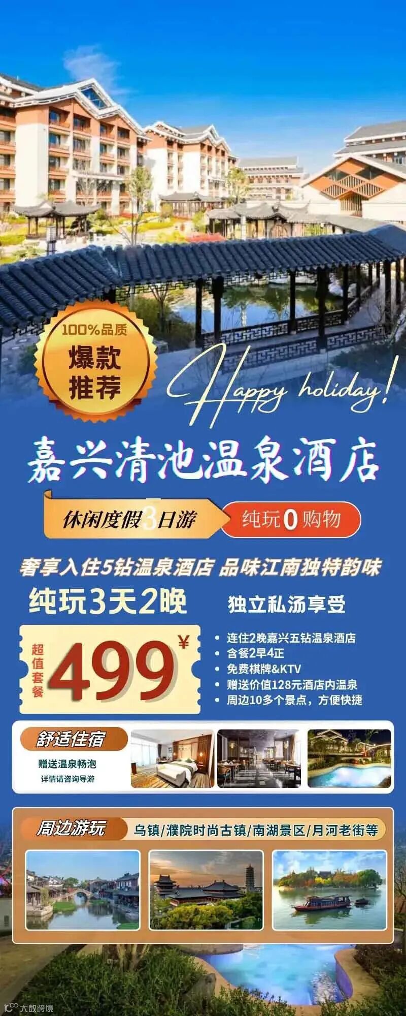 早7:30人民广场博物馆集合发车(具体时间地点以司机通知为准),约2小时抵达嘉兴入住清池温泉酒店;