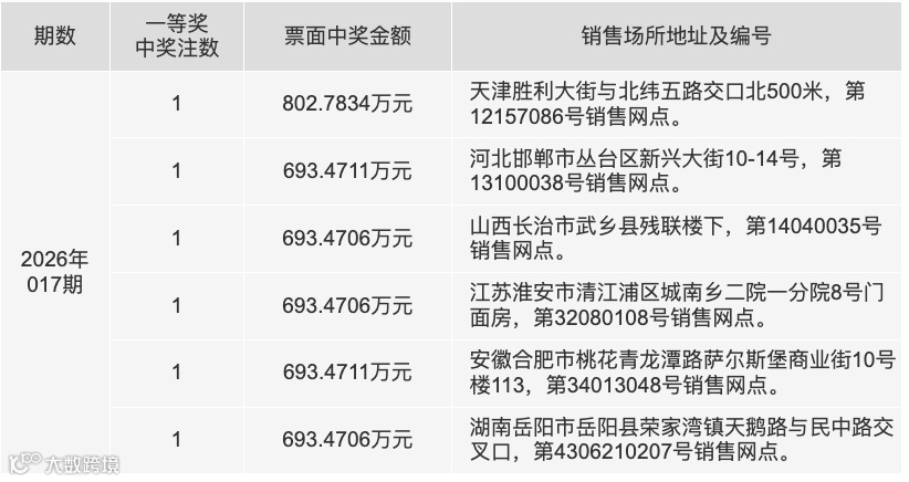 本期全国共开出6注一等奖,