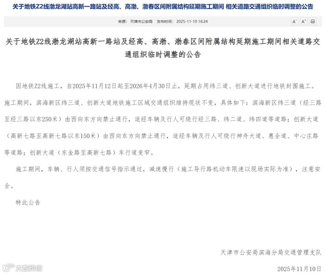 因地铁Z2线施工,自2025年11月12日起至2026年4月30日止,延期占用纬三道、创新大道进行地铁封围施工。施工期间,滨海新区纬三道、创新大道地铁施工区域交通组织维持现状不变,具体如下:滨海新区纬三道(经三路至经三路以东250米)由西向东方向禁止通行,途经车辆及行人可绕行经三路、纬二道、纬四道等道路;创新大道(高新七路至高新七路以东150米)由西向东方向禁止通行,途经车辆及行人可绕行神舟大道、惠全道、中心庄路等道路;创新大道(东金路至高新七路)车行道变窄。