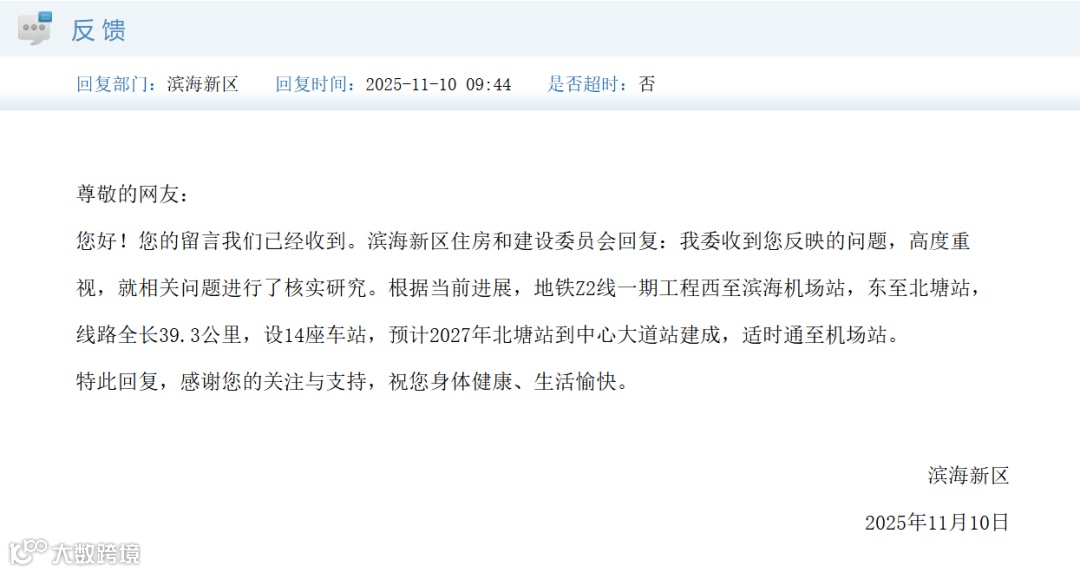 滨海新区政府回复:根据当前进展,地铁Z2线一期工程西至滨海机场站,东至北塘站,线路全长39.3公里,设14座车站,预计2027年北塘站到中心大道站建成,适时通至机场站。