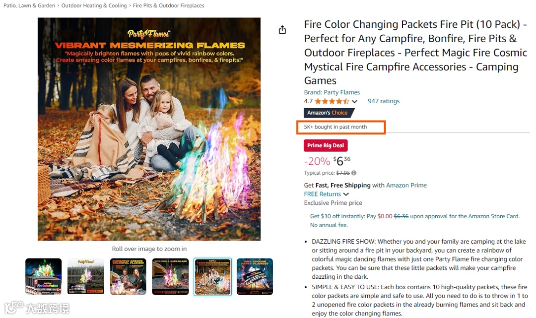 变色火包来自Party Flames,一个专注于增加篝火趣味的品牌。该款变色火包售价6.36美元,数据显示上月销量达5K+。产品使用方式也十分简单,将1-2个火彩包扔进正在燃烧的火堆中,经过燃烧反应,火焰即可呈现出各种炫彩的颜色。