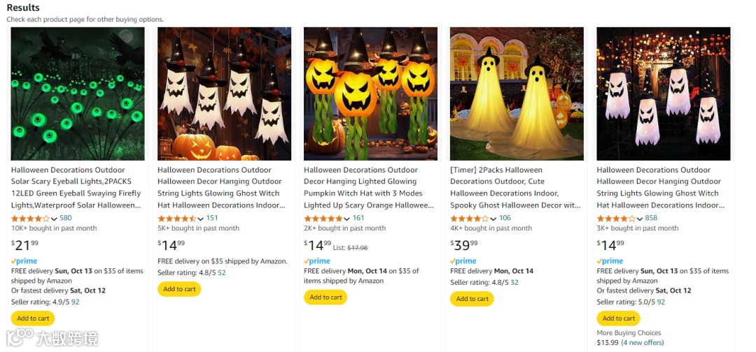 搜索庭院装饰产品,销量最高的均为万圣节主题产品。据Capital One Shopping数据显示,2023年万圣节美国人的总支出高达122亿美元,仅糖果支出就36亿美元。尤其是万圣节和圣诞节,海外消费者在装饰方面的花费较其他节日更高,且消费意愿更强。无论是庭院装饰还是万圣节糖果,早在九月份就已开启抢购热潮。