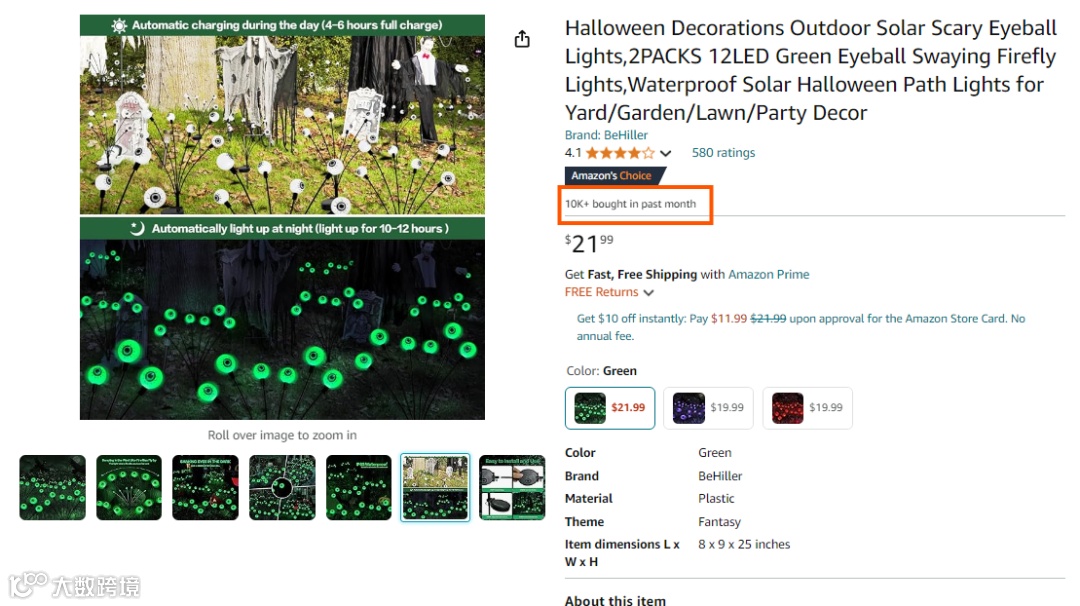 该款夜光眼球灯来自BeHiller,售价21.99美元,亚马逊显示上月已售出超过万件。眼球灯采用太阳能供电设计,适用于庭院、花园、草坪和派对装饰。尤其在即将到来的万圣节,3D设计和摇摆的眼球看起来十分立体逼真,充血的眼球与诡异的绿光相结合,可轻松营造恐怖氛围。