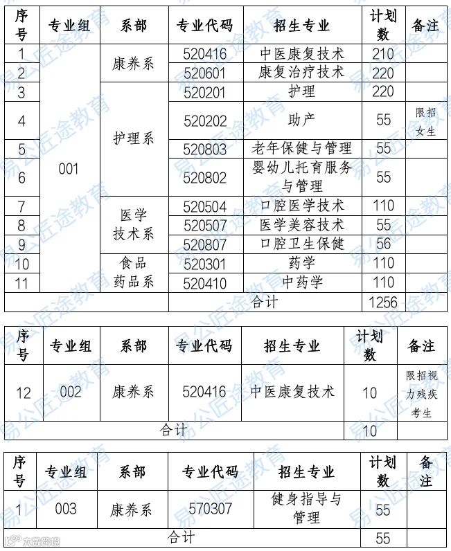 2025年单独招生计划共1321人(其中001组-002组医药卫生类1266人、003组体育类55人)。未公布报考人数。具体招生计划如下: