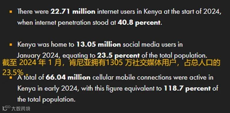 随着互联网与智能手机的普及,社交平台的大流行使得社交电商成为非洲电商的新风口。据DataReportal数据显示,截至2024年初,肯尼亚18岁以上的社交媒体用户已经达到了1305万,其中49%的肯尼亚用户通过 TikTok、Instagram、Facebook、WhatsApp等社媒平台购物。