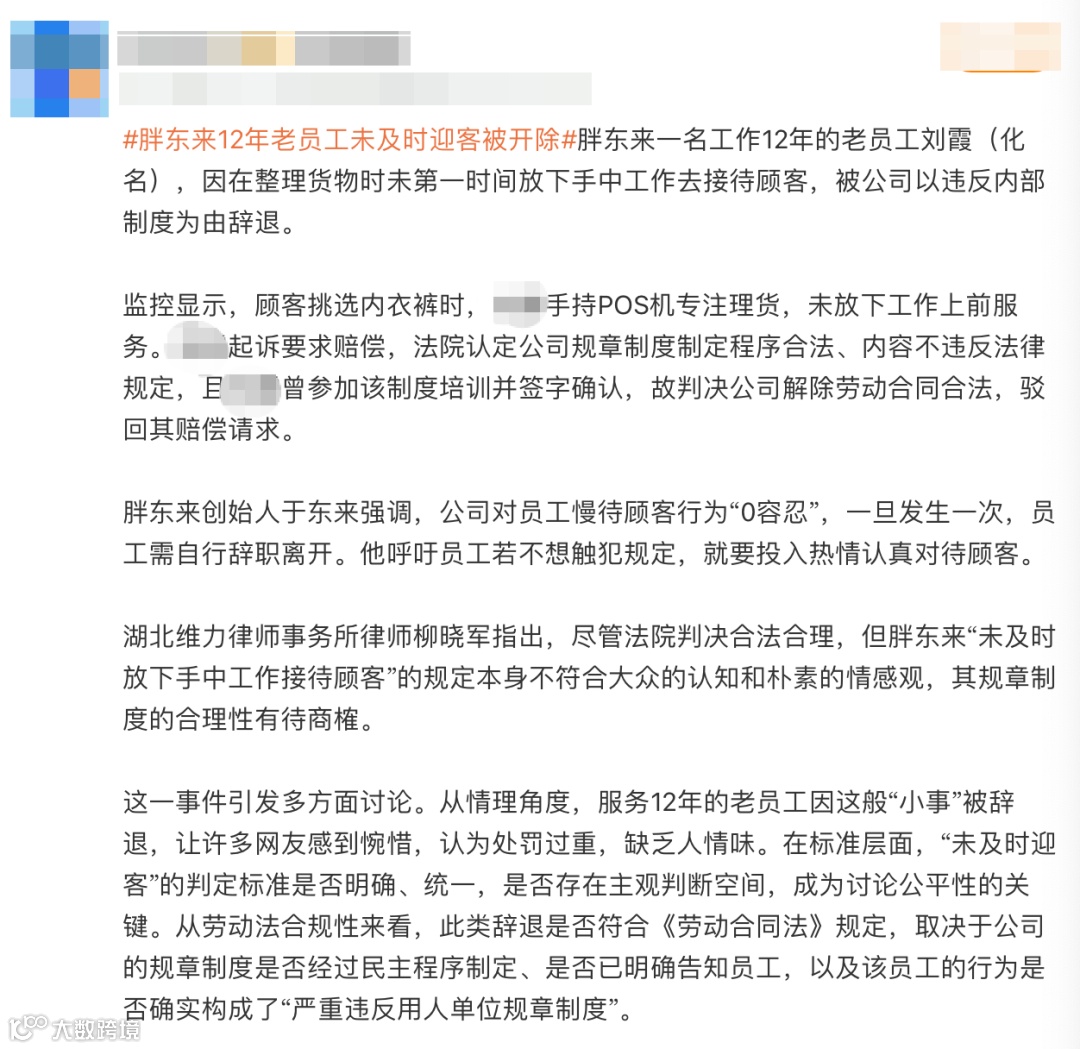 2025年,一则“胖东来辞退12年老员工”的新闻冲上热搜。原因并非业绩不达标,而是该员工一次“未及时接待顾客”,违反了公司的服务制度。哪怕这位员工已在公司服务12年,胖东来依然依据内部规定解除了劳动合同,并最终赢得了相关劳动诉讼。
