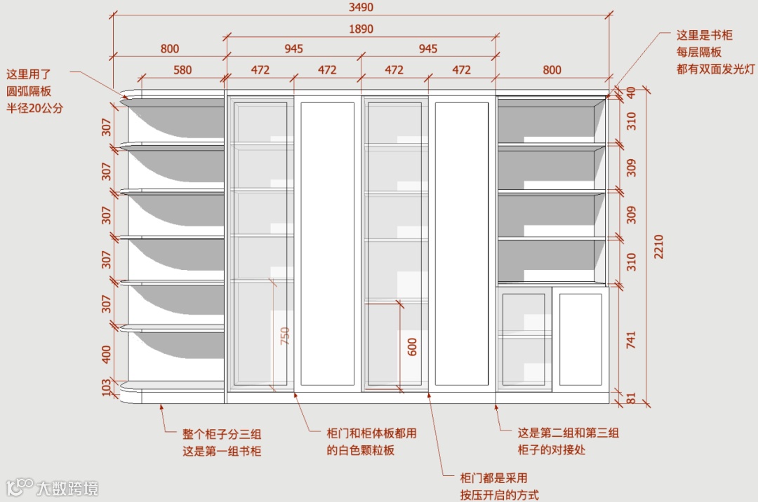 沙发对面是一组收纳柜,设计师考虑到小朋友的安全,在书柜的转角处做了弧形处理。