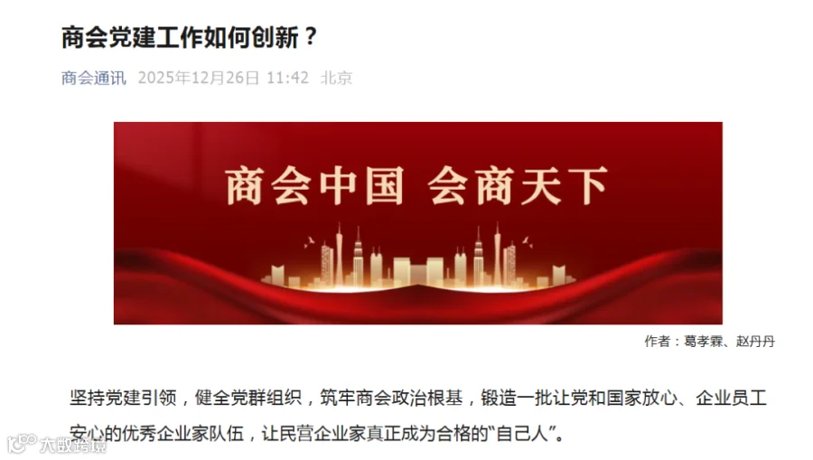 12月26日,《商会通讯》全文刊登我会秘书长葛孝霖、副秘书长赵丹丹撰写的办会经验《商会党建工作如何创新》,敬请关注。