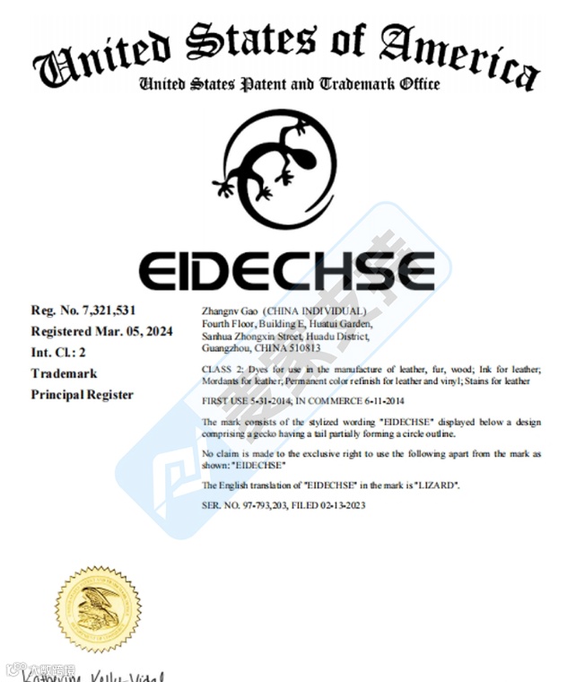 Eidechse是一个专注于皮革护理和修复的中国品牌,致力于为消费者提供优质的皮革保养产品和解决方案。Eidechse品牌主要在电商平台如亚马逊等进行销售,拥有一定的市场份额和消费者群体,为保护其知识产权,Eidechse于2024年3月在美国注册了商标,并接连在佛罗里达州和伊利诺伊州发起TRO维权,跨境卖家速排查!