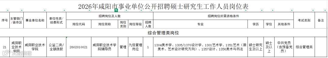 附件1:2026年咸阳市事业单位公开招聘硕士研究生工作人员岗位表(点击打开).xls