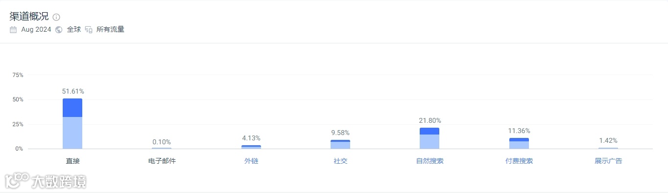 根据similarweb数据显示,Rumpl官网的流量主要来自于直接访问流量(51.61%)、自然搜索流量(21.8%)、付费搜索(11.36%)、社交媒体(9.58%)。