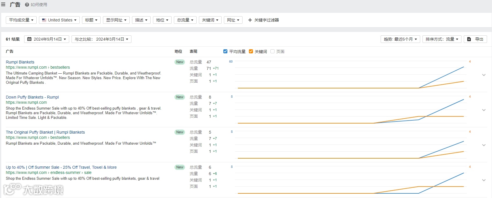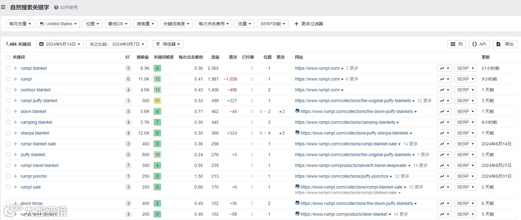 关键词:根据ahrefs数据显示,Rumpl布局的自然搜索关键词,难度都较低,所以Rumpl都将其做到了排名靠前的位置。除了与其品牌相关以外,我们会发现其选择的品类核心关键词难度也同样较低。