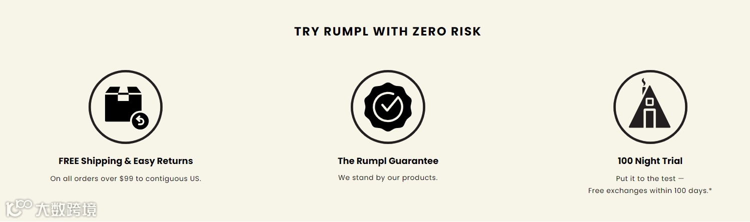 售后保障:在面对高价位的户外装备时,消费者通常会担心产品是否符合预期,Rumpl提供100晚免费试用和免费更换服务,可以有效降低消费者的购买风险,从而增强消费者购买信心。