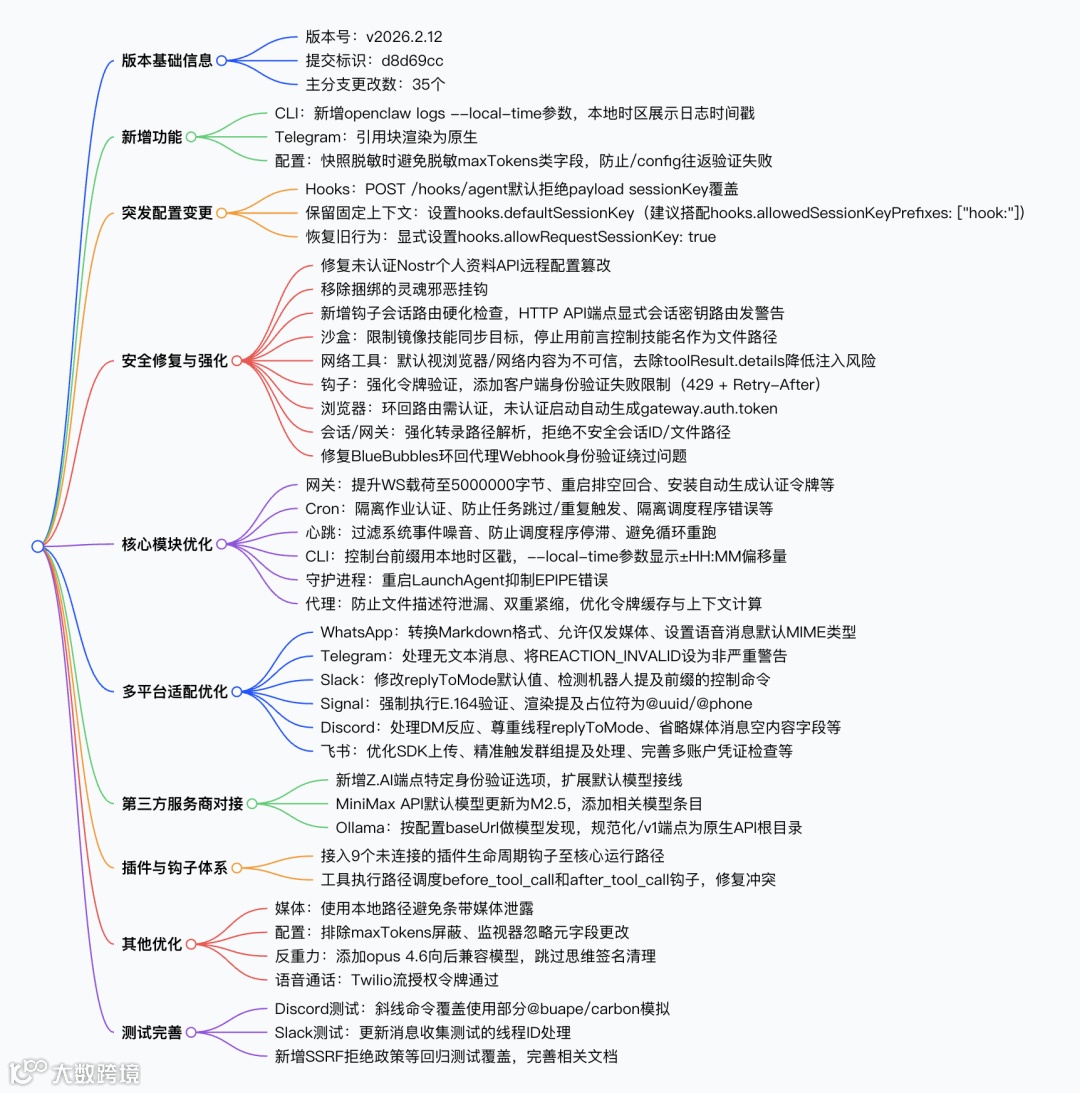 编者摘要:Openclaw 发布v2026.2.12版本(提交标识 d8d69cc),自发布后主分支完成35 个更改,本次更新核心包含CLI、Telegram、配置项的功能新增与优化,POST /hooks/agent的突发配置规则变更,同时围绕网关、会话、沙盒、网络工具等模块开展全维度安全强化与漏洞修复,针对 Cron 定时任务、网关、代理等核心模块解决了多项运行异常问题,完成 WhatsApp、Telegram、飞书等多平台的适配优化,完善了第三方服务商对接、插件钩子体系及测试覆盖,还修复了各类场景下的执行、兼容问题,全面提升了系统的安全性、稳定性和兼容性。