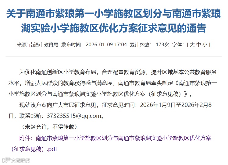 1月9日,南通市教育局发布《关于南通市紫琅第一小学施教区划分与南通市紫琅湖实验小学施教区优化方案征求意见的通告》,涉及紫琅一小东西两校区及紫琅湖实验小学,值得家长关注!