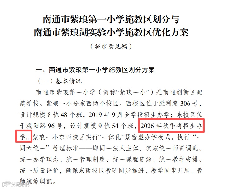 在本次征求稿中,紫琅湖实小原先划定的施教区范围不变,增加其代招区的部分区域。