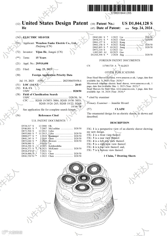 经查询,这款产品于2023年8月23日在美国进行外观专利申请的提交,于2024年9月24日获得了公告。