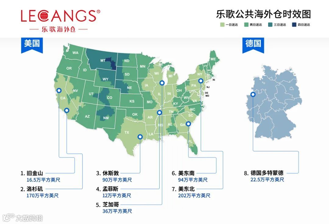 乐歌海外仓在全球多点设仓,面积约668万平方英尺,约95%的订单可实现次日达的时效。