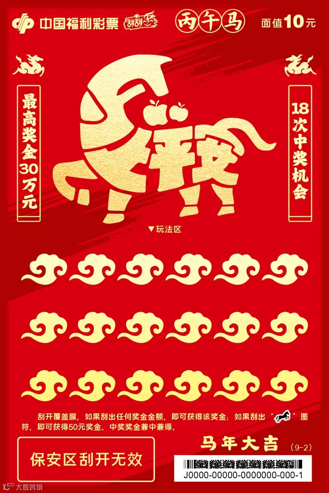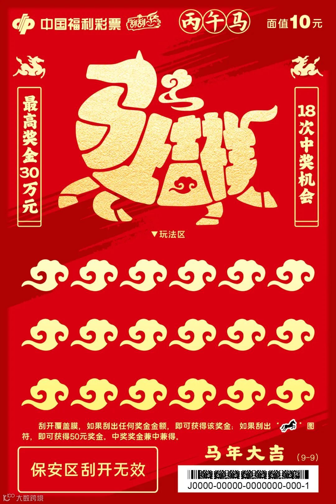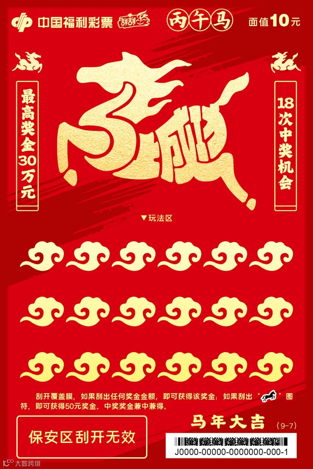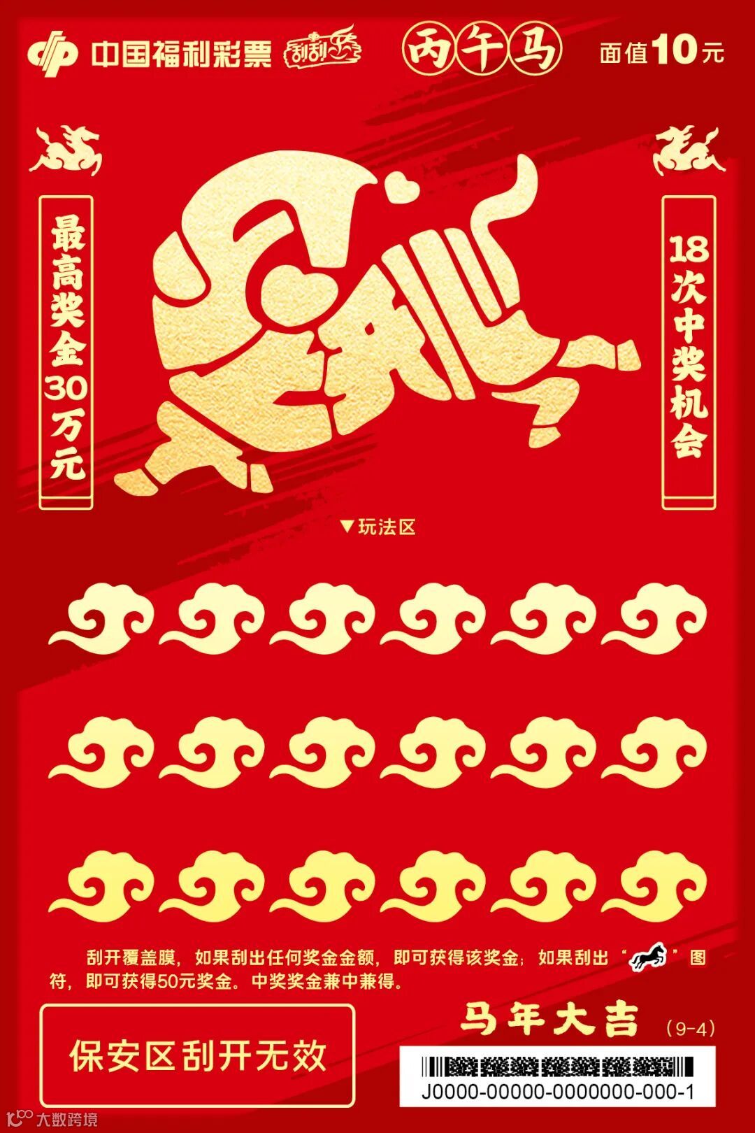 “骏马迎春”系列,单款成辑,独具一格。票面主体为一匹鎏金骏马,昂首腾跃,姿态昂扬,肌理流畅,在红金配色的映衬下愈显华贵大气,完美诠释了“马到成功,金玉满堂”的传统吉兆。玩法区的覆盖膜也暗藏巧思,元宝、回纹福字、如意云纹三种浮雕纹样精巧点缀,分别寓意招财、纳福与万事如意。方寸之间趣味横生,在古典寓意与现代审美间取得精妙平衡,尽显设计巧思与厚重底蕴。