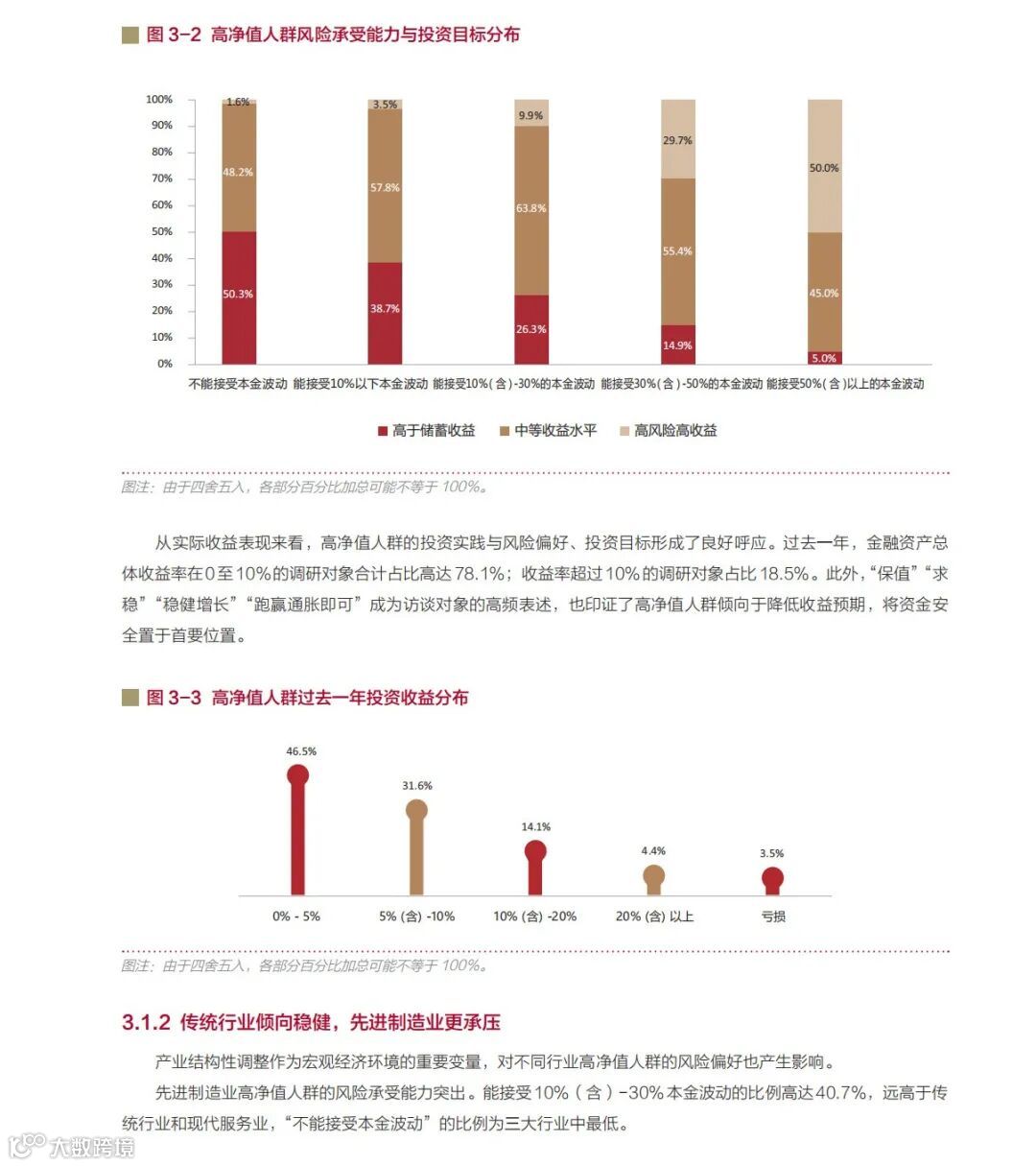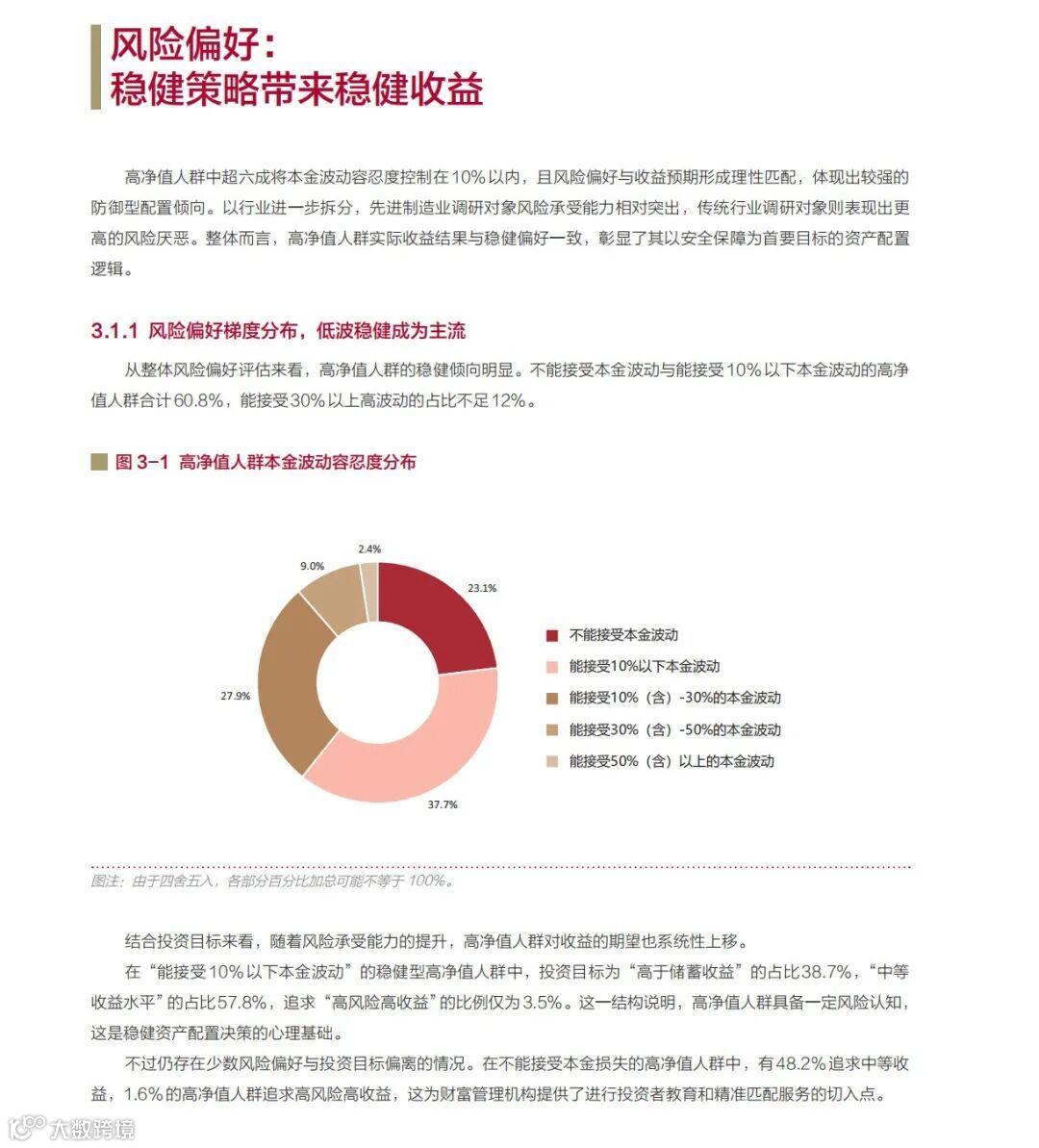 从行业来看,传统制造、零售、房地产仍是财富核心来源,而现代服务业、先进制造业的占比持续提升,且后两者的高学历人群占比更高,财富管理的专业需求也更精细化。先进制造业人群的风险承受能力最强,40.7%可接受10%-30%的本金波动,而传统行业人群风险厌恶特征明显,67.1%不能接受或仅能接受10%以下波动,这种行业差异直接决定了资产配置的风格走向。