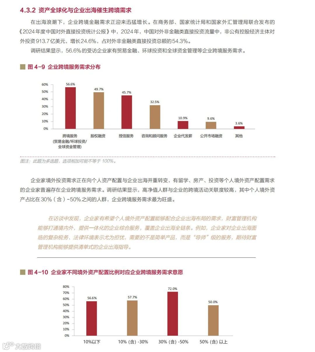对于企业家客群,企业与家庭财富的深度绑定,让“家企联动”的一体化解决方案成为迫切需求。中小型企业关注股权融资与授信,大中型企业侧重环球投资与全球资金管理,而56.6%的企业家有跨境服务需求。