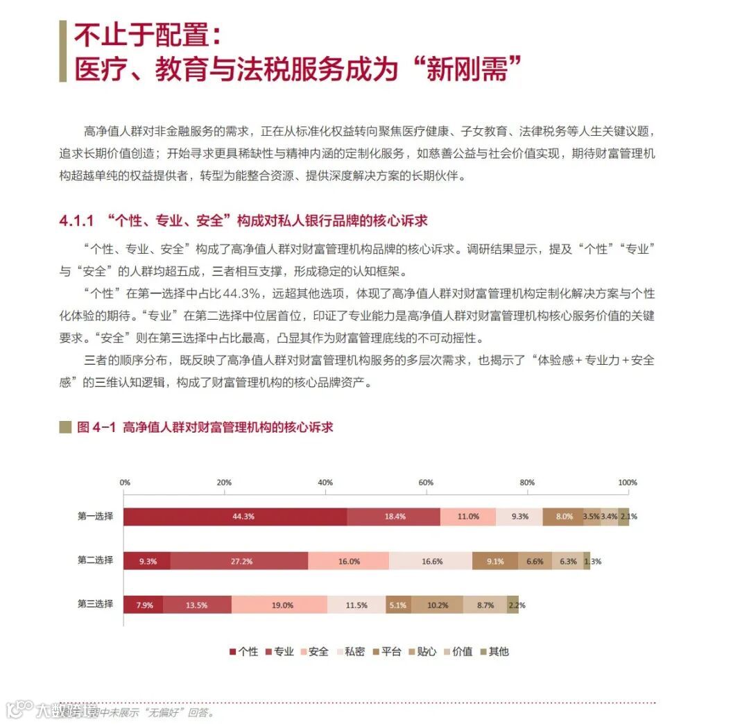 高净值人群的核心诉求已聚焦于个性、专业、安全,其中“个性”的提及率达44.3%,而服务需求也从单一的金融服务,延伸至覆盖家族生活、企业发展、代际传承的全生态领域,“家企联动”成为企业家客群的核心诉求。