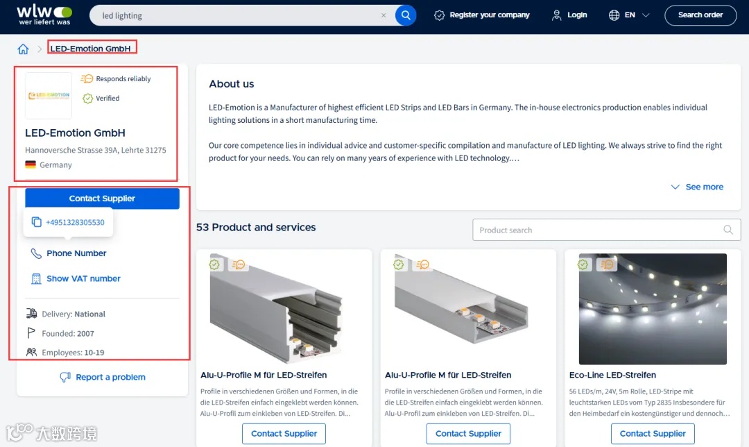 打开其中一个LED-Emotion GmbH公司,可以看到有公司基本介绍,详细地址,电话以及成立时间,以及具体产品信息等