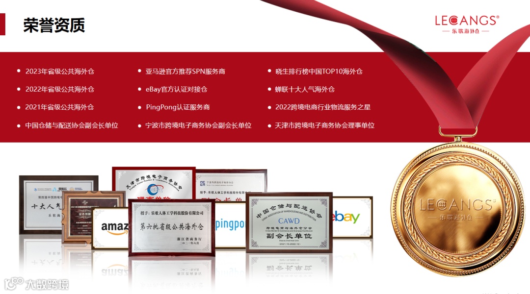 乐歌海外仓连续三年入选浙江省省级公共海外仓,获得亚马逊SPN官方推荐物流服务商、eBay官方认证对接仓、三次蝉联十大人气海外仓、晓生排行榜中国TOP10海外仓等荣誉