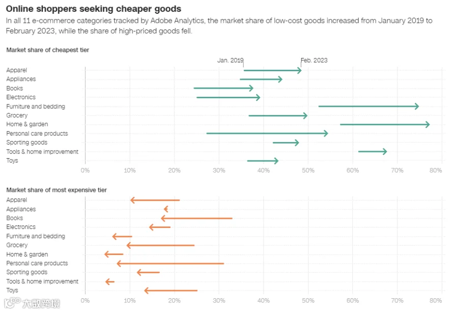 Adobe Analytic的数据表明,自2019年1月到2023年2月多个品类的低价商品市场占额持续上升,高价商品的市场占额持续下降。