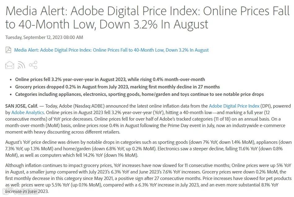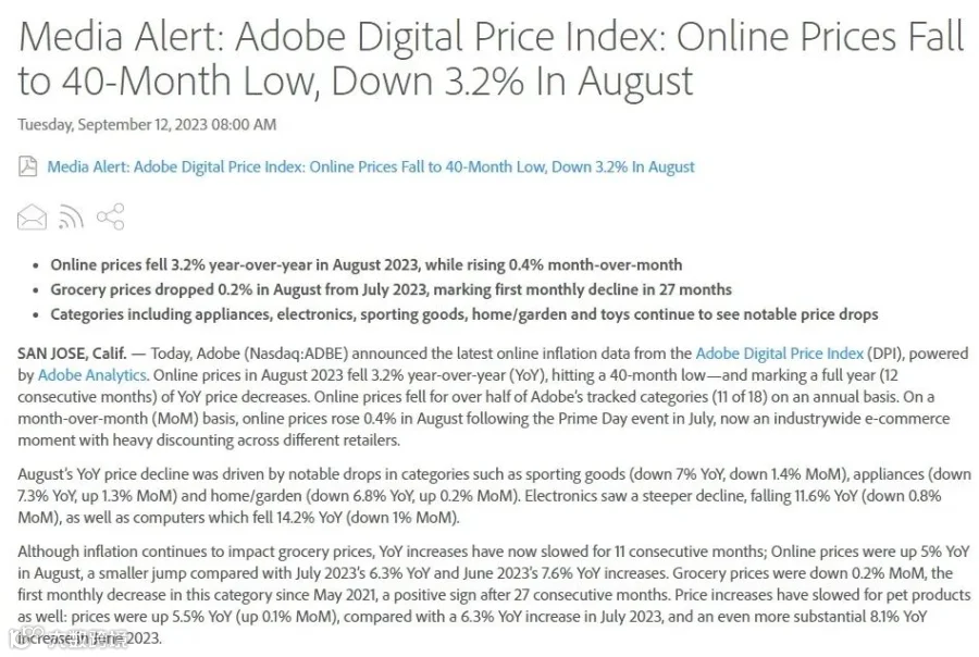 近日,Adobe还公布了美国在线零售市场的最新通胀数据。根据Adobe数字价格指数(DPI),2023年8月美国在线价格同比下降3.2%,达到40个月以来的最低水平。而按月环比计算(与7月相比),2023年8月在线价格上涨了0.4%。