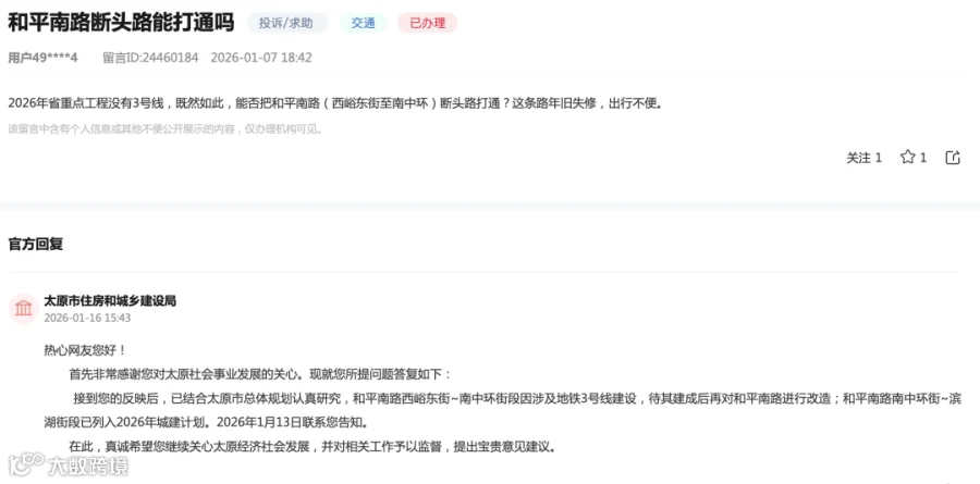 2026年省重点工程没有3号线,既然如此,能否把和平南路(西峪东街至南中环)断头路打通?这条路年旧失修,出行不便。