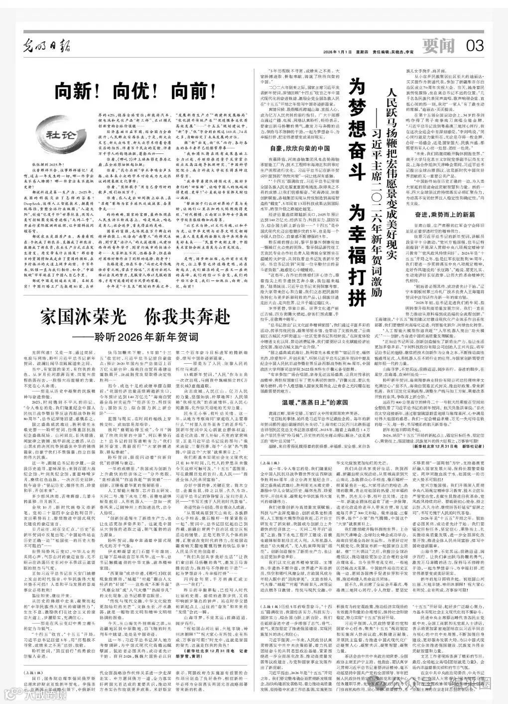 辞旧迎新的时刻,总给人以温暖和力量。新的希望、新的期许,正在人心深处生长。“事业有成”“身体健康”“生活幸福”“国泰民安”……一个个朴素而炽热的愿望,寄托着人们对美好生活的向往,折射出奋斗圆梦的强大内生动力。