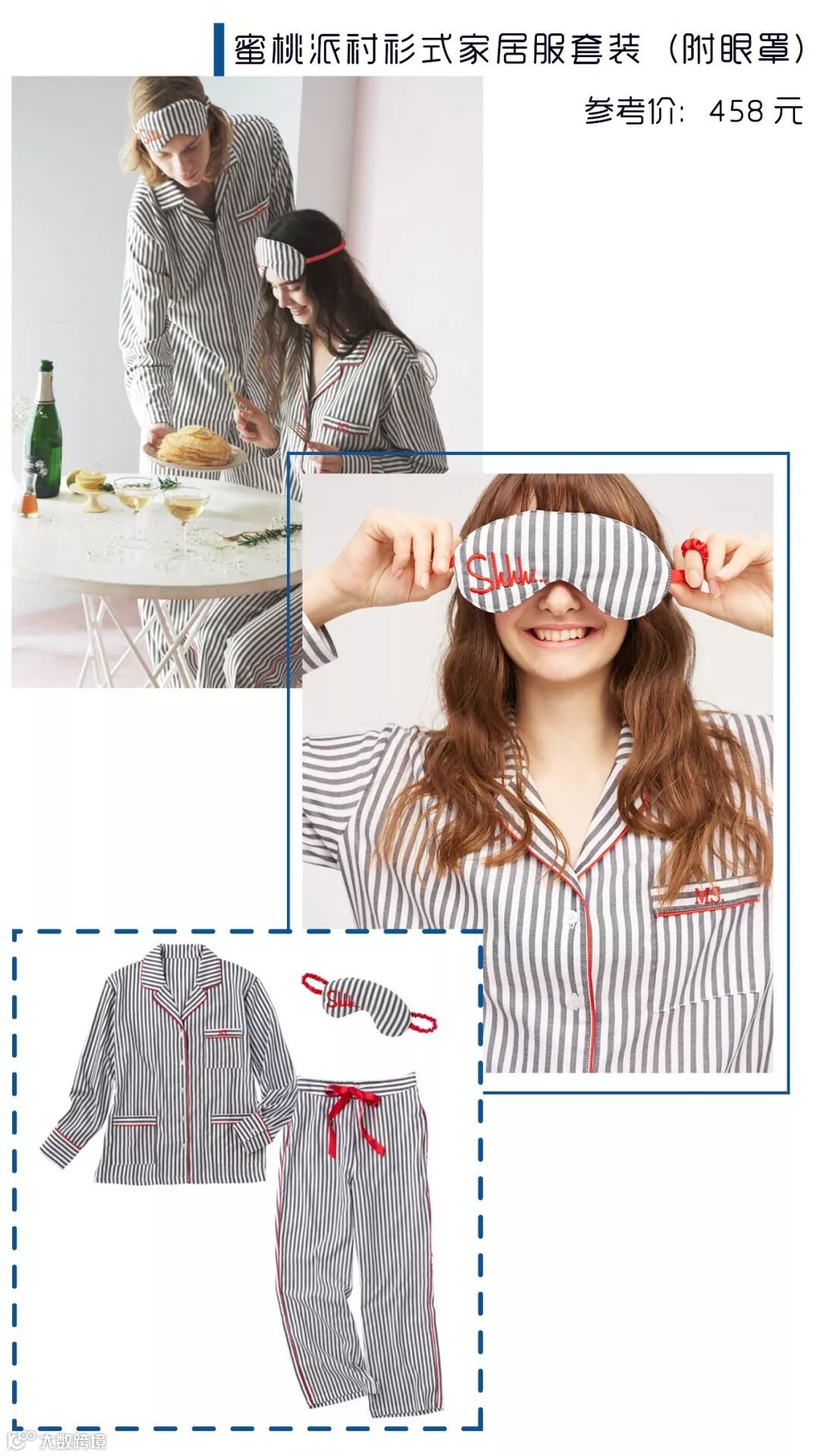 条纹款式搭配眼罩,套装设计贴心,共四种花色可选,袖口刺绣细节加分。
