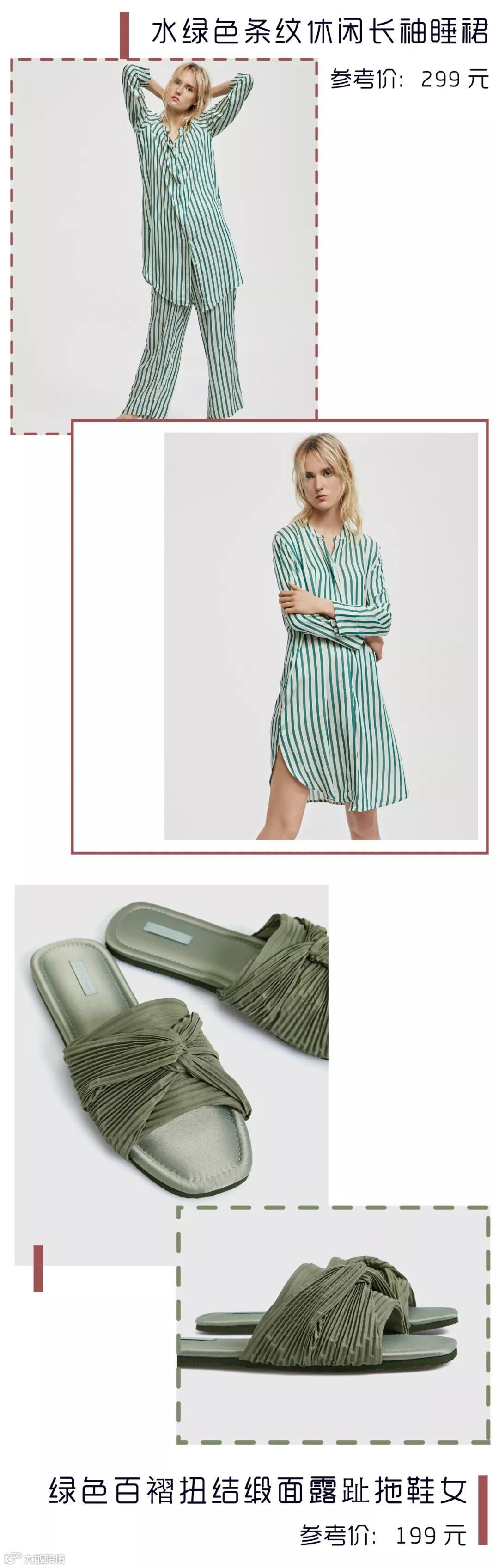 墨绿色条纹睡裙气质出众,同色系拖鞋设计精致,几可作为外出鞋履。